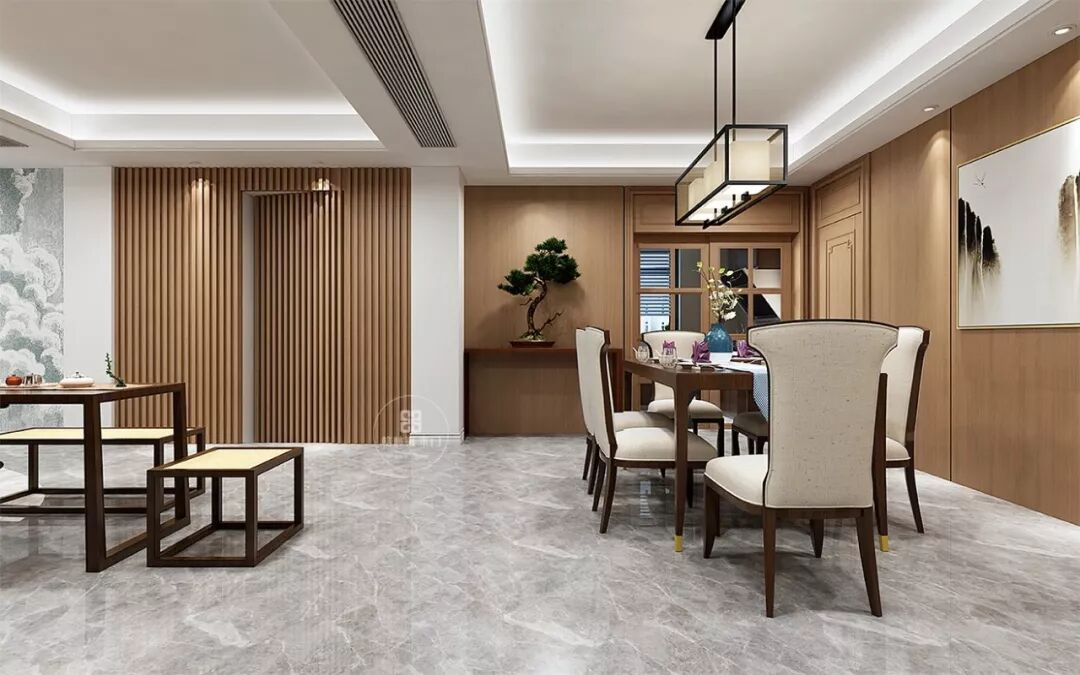 空间的整体视觉以白色、木色、暖灰色为主调,辅以一些清透,灵动的山水画点缀其中,体现现代中式中的含蓄之美。