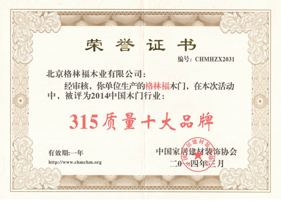你知道吗?“中国3.15”在消费者心中******是神圣不可侵犯的,它是消费者权益被受保障的一把利剑。2014年3月,由中国家居建材装饰协会评选,格林福木门被评选为中国木门行业315质量十大品牌。