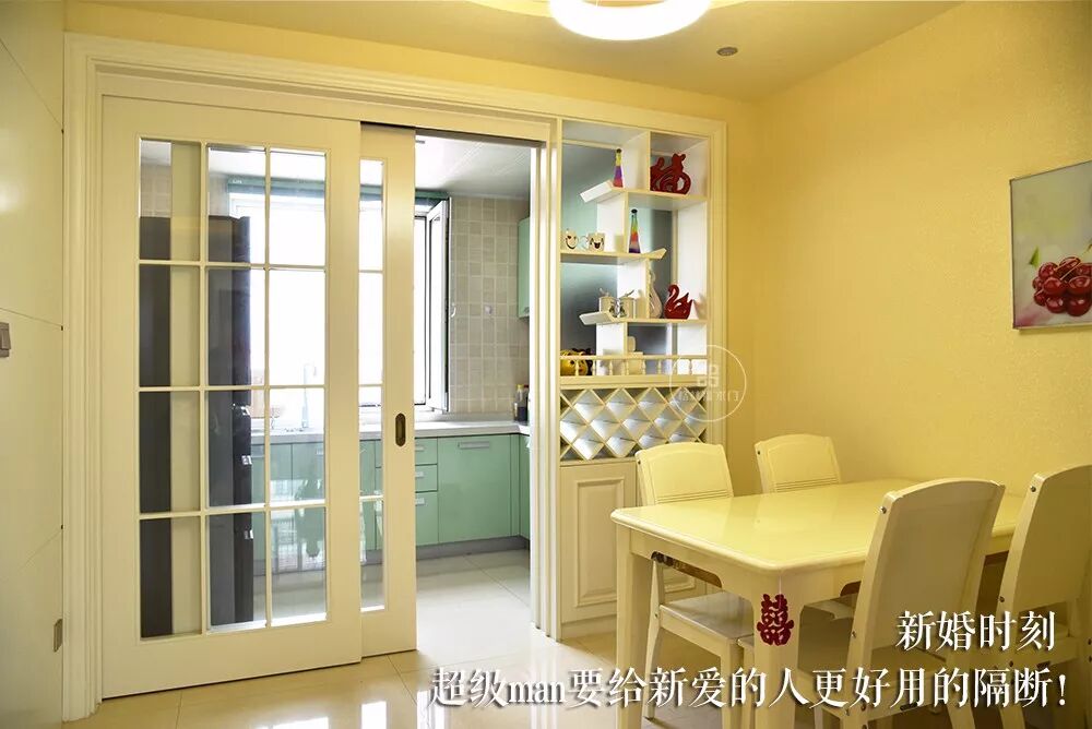 谈不上寸土寸金,也称得上一块宝地了,小户型本身储物空间有限,新婚时刻,超级man一定要给自己心爱的人更多的呵护,餐厅和厨房之间怎能没有储物空间呢?